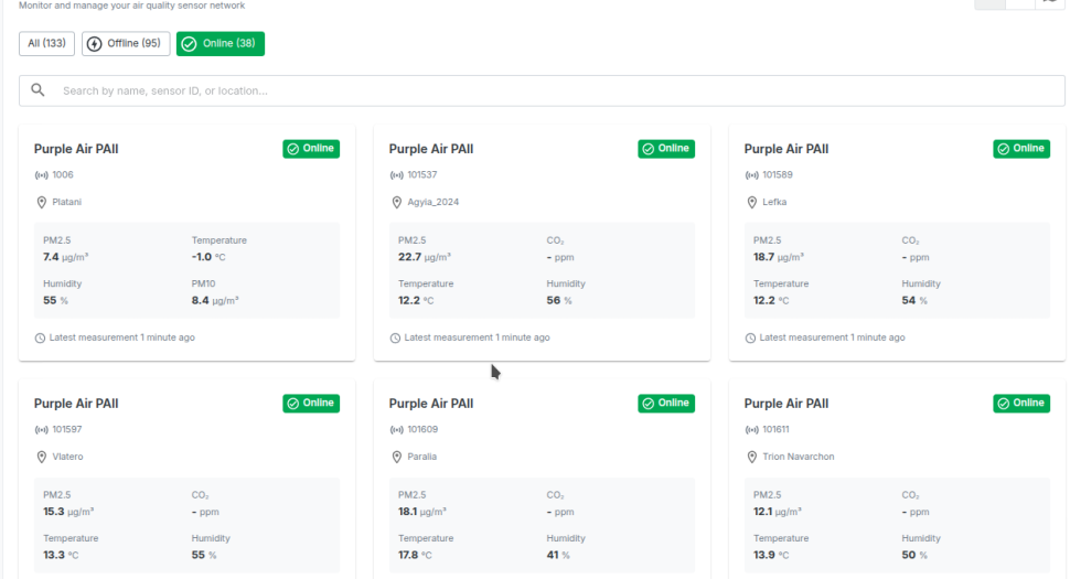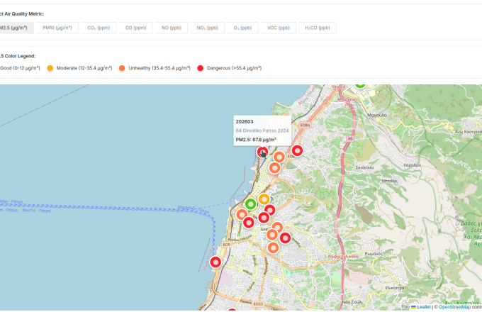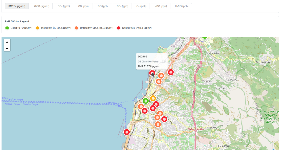 Η κάθετη εφαρμογή «Ποιότητα Αέρα @ Πάτρα» παρέχει μια ενιαία εικόνα των επιπέδων ατμοσφαιρικής ρύπανσης, με δυνατότητες παρακολούθησης σε πραγματικό χρόνο, ανάλυσης τάσεων και παραγωγής δεικτών. Η πλατφόρμα υποστηρίζει επιχειρησιακή χρήση από φορείς, καθώς και τεκμηριωμένη αξιολόγηση της κατάστασης του αέρα σε χωρικό και χρονικό επίπεδο.
